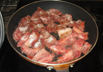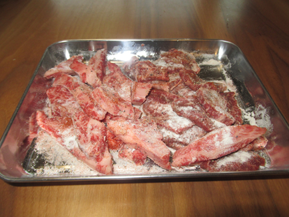 - 牛肉を必要に応じ食べやすい大きさに切り、塩、胡椒、パプリカパウダー、小麦粉にまぶす。