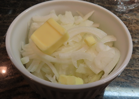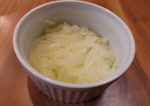 - 玉ねぎを1/4に切って薄切り、これをレンジOKの器に入れバター半量を載せて500Wで4分間温める。様子を見て十分しんなりしていなかったら更に1分温める。