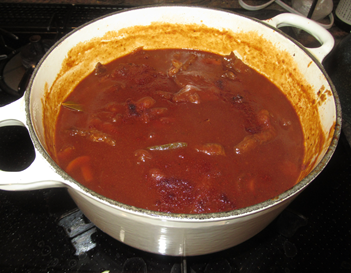 - ドミグラソース、赤ワイン、トマトピューレを入れローリエを加えて弱火から中火で15分程度煮込む(焦げないように注意)。