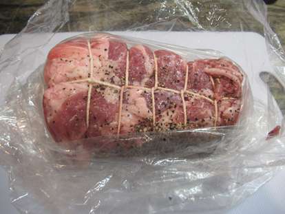 - 肉に2cm間隔で横糸を結ぶ。縦糸を横糸に巻き付けながら全体を一周させて結ぶ。(適当で良い)