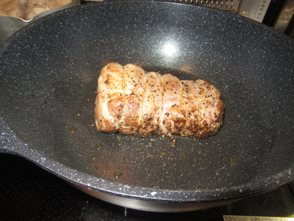 - 豚肉の水分をキッチンペーパーでふき取り、熱したフライパンで全面に焼き目をつける。全体に焼き色がつくまで焦がさないように注意しながら焼く