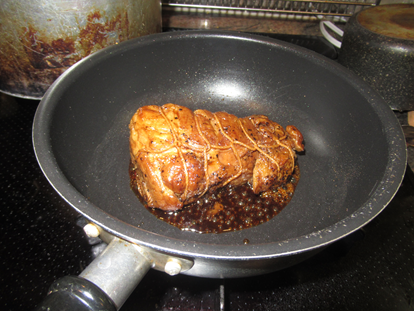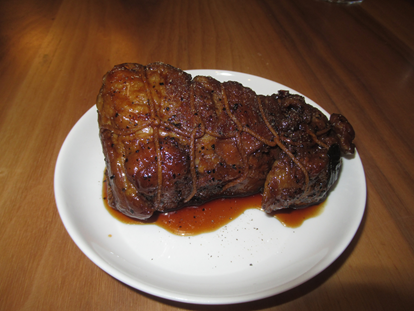 - 焼いた肉を鍋に入れ水をひたひたまで入れる。弱火にかけじっくり時間をかけて沸騰させる。沸騰したらアクを取り、落としぶたをして45分~1時間ほど煮込む。竹串を刺して透明な肉汁が出たら火をとめる。(煮汁の再活用は文末の追加メニュー参照)