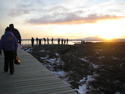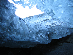 南海岸探訪ツアーも心に残るものでした。一押しは海岸近くまで張り出し、直に触れることができるソルヘイマヨークトル氷河の先端部です。遠くから見ると山肌を覆う泥に薄汚れた氷の塊ですが、近寄ってみるとところどころ溶けて洞穴状になり、中を覗くと空の色を投影し青みがかった色合いが刻々と変化して神秘的な表情を見せます。その他、海岸線沿いに点在する滝には虹がかかり、玄武岩の崖は厳しい波に削られてパイプオルガンのような姿を見せます。帰路バスの車窓を彩る夕焼けにも心を奪われます。静かな冬景色はtranquilという形容詞がぴったりです。