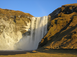 南海岸探訪ツアーも心に残るものでした。一押しは海岸近くまで張り出し、直に触れることができるソルヘイマヨークトル氷河の先端部です。遠くから見ると山肌を覆う泥に薄汚れた氷の塊ですが、近寄ってみるとところどころ溶けて洞穴状になり、中を覗くと空の色を投影し青みがかった色合いが刻々と変化して神秘的な表情を見せます。その他、海岸線沿いに点在する滝には虹がかかり、玄武岩の崖は厳しい波に削られてパイプオルガンのような姿を見せます。帰路バスの車窓を彩る夕焼けにも心を奪われます。静かな冬景色はtranquilという形容詞がぴったりです。