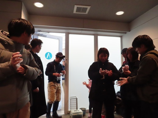 - フィッシュダンス予約者はチェックイン時に渡された入場証を提示することで特別な入口に入館。段取りの説明を受ける。餌やりタイムの準備。