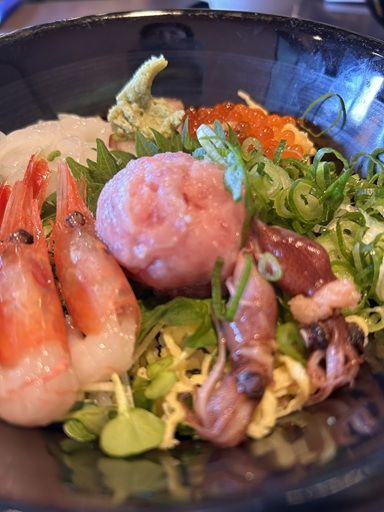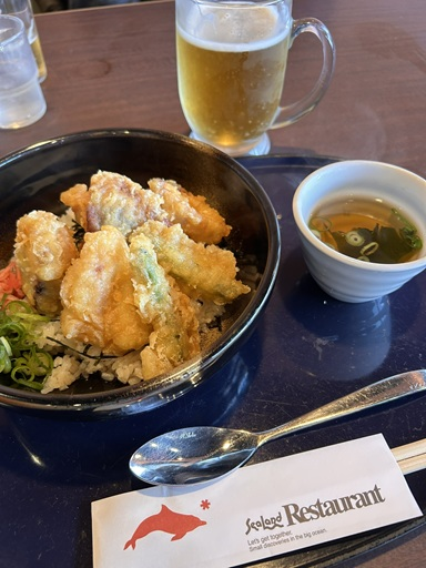 - シーランドレストランでイカ天丼1550円海鮮丼2450円を賞味。ライスは少なめで我々にとっては嬉しかった。
