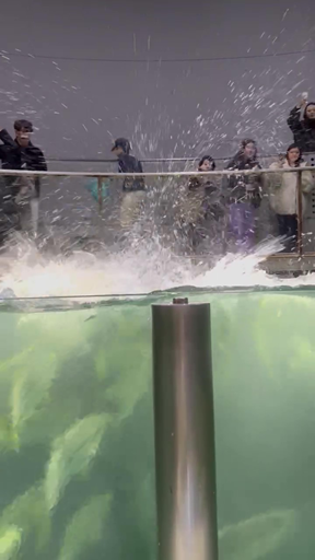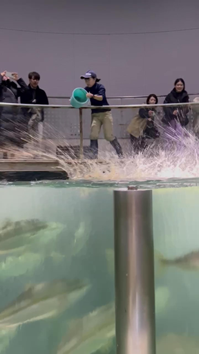 • 丸い水槽を高速で泳ぐブリの大群が生のエサに群がる姿は圧巻