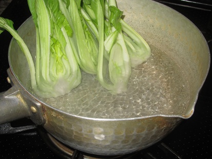 - チンゲン菜の根の部分を湯に入れ1~2分ゆでる。(固めが好みの場合)