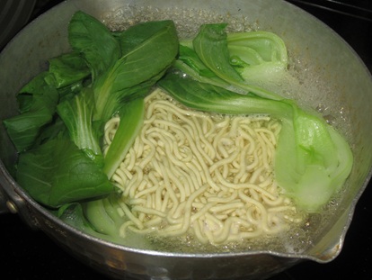 - 麺を加えチンゲン菜の葉の部分も湯に浸かるようにする。