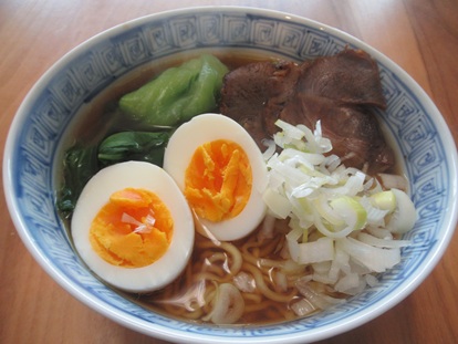 - その上に麺、チンゲン菜の順で入れ、その他の具を載せたら出来上がり。