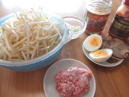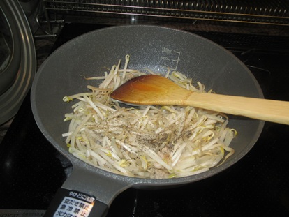 • もやしをフライパンに投入するのと麺の茹でるのを同時に始めて丁度良いくらいだが、慣れない場合もやしを先に炒めた方が確実。