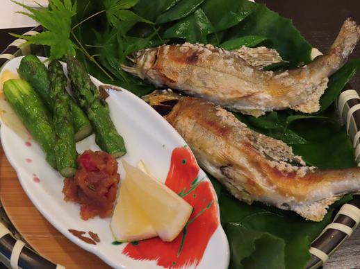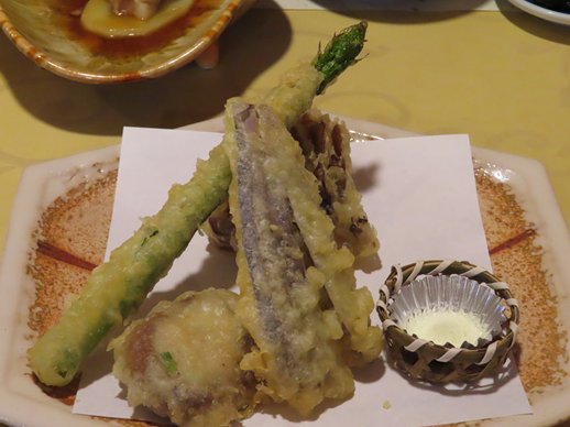 - 季節のアスパラガスや舞茸、ナスなどの天ぷらも揚げたてで塩で食べると絶品です。