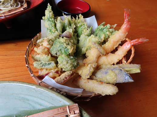 - すいている時だけ出すというてんぷらの盛り合わせも海老天の他、地の野菜、山菜など揚げたてがてんこ盛りで美味!山の元気を体に取り込みます。