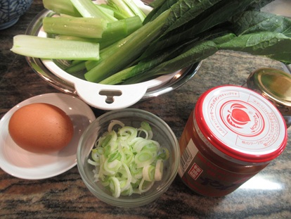 - 鍋に420ccの湯を沸かし(表示は450ccだが小松菜の水分を考慮)麺を3分ゆでる。(表示は4分だが固めが好みのため)