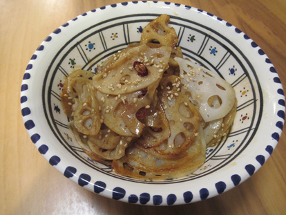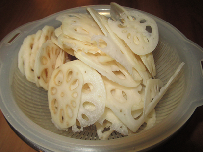 - レンコンの皮をむいて薄切りにして水にさらす。(皮はむかない、水にさらさないと言う人もいる)